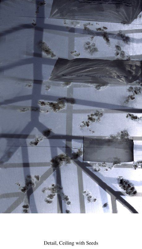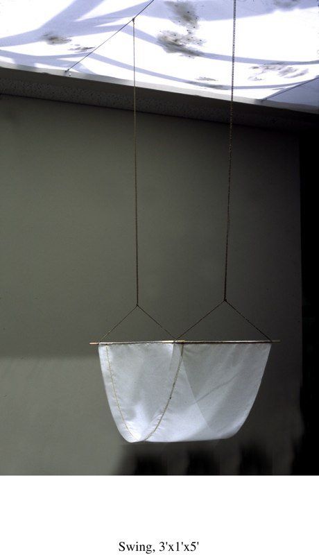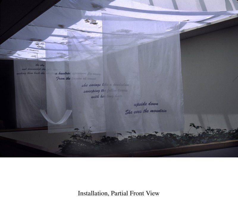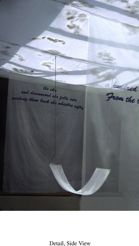 The installation ‘Ruach’ consists of four hanging transparent voile panels with a silk screened poem, an embroidered fabric swing, and a transparent fabric ceiling scattered with floss silk tree seeds, all suspended 22ft above the ground.