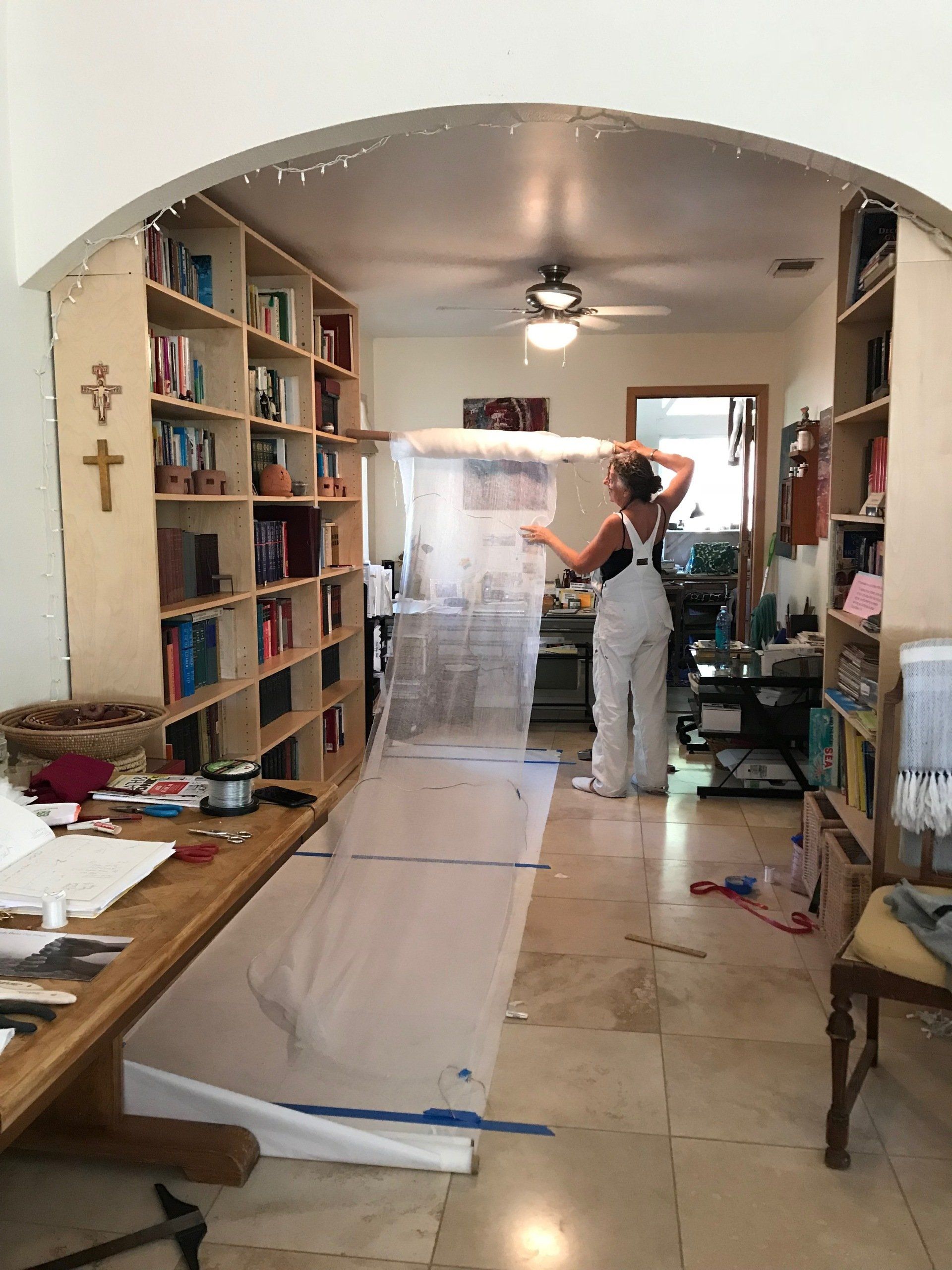 Different symbolic elements were used: fabric, gold cord, water and salt. The hand embroidered fabric (gauze), covering the top part of the fence, was representing the seen/unseen Presence and protection of God.